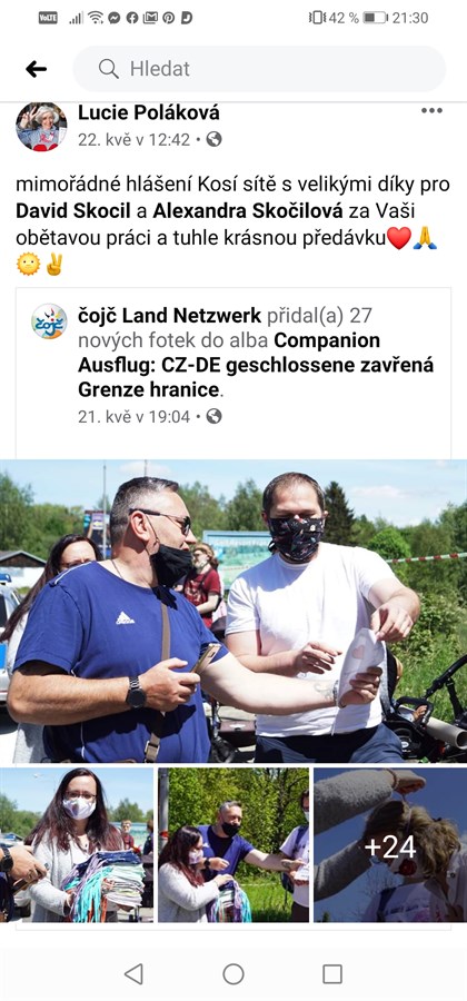 Dobrovolnická šicí síť KOS z.s. dodává od16. 3. 20 ochranné roušky do první linie (zdravotníci, integrovaný záchranný systém, sociální služby, léčebny dlouhodobě nemocných, domovy pro seniory, ale také samostatné domácnosti seniorů, kterým členové naší sítě obstarávají nákupy, léky a vše potřebné). Produkce je více než 13 000 roušek potřebným do první linie za 80dní. Roušky rozdáváme zdarma. Poskytli jsme potřebným i ochranné štíty a desinfekci. Roušky jsme dodali i sousedům do Německa. Zřídili jsme distribuční centrum roušek v centru Chebu. Pořádáme pro veřejnost výstavu o příběhu KOSí sítě. Dobrovolnictví je skvělým příkladem, jak individuální občanská aktivita může spouštět komunitní a společenskou solidaritu.