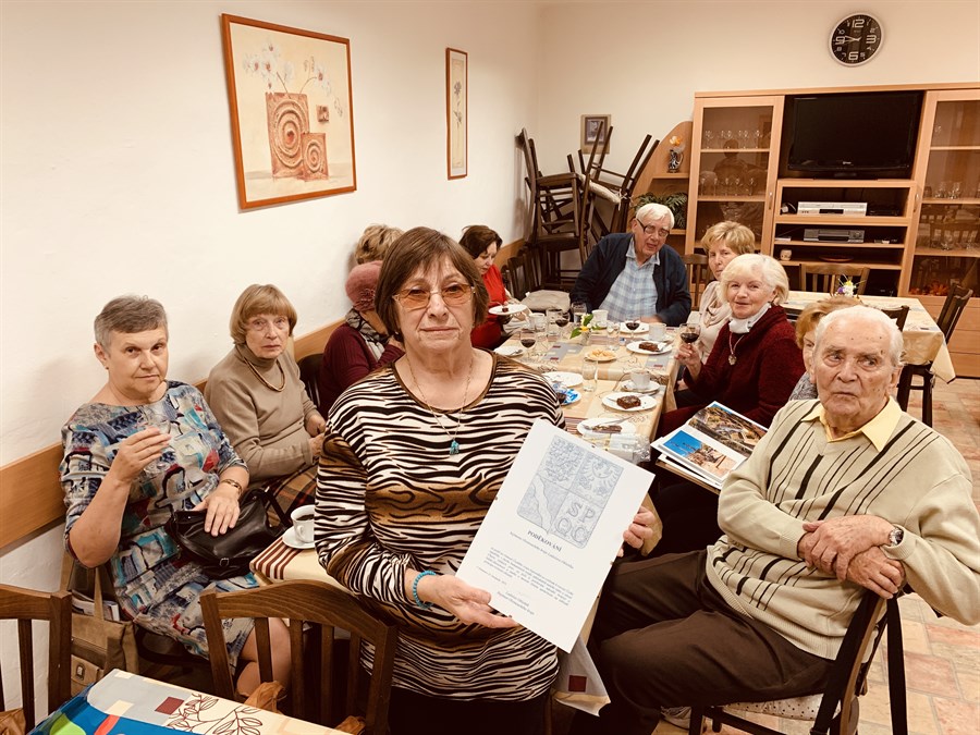 Oslava narozenin pro Ing. Jiřího W. v Kontaktním centru pro oběti nacismu a mezigenerační dialog. Po jeho levé straně sedí jeho vnuk, po právě straně německá dobrovolnice Živé paměti, Maja.