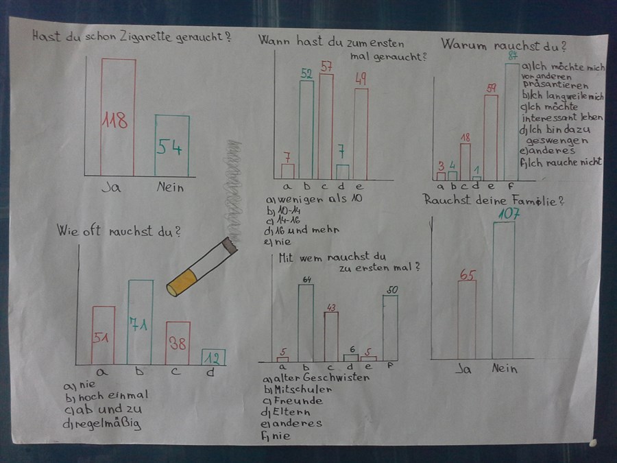 K prvnímu setkání obou škol došlo v době od 6. do 11. října 2014 v Třebíči. Studenti vyhodnocovali výsledky cca. 200 dotazníků (z každé školy) ohledně konzumu cigaret, alkoholu a marihuany. Výsledky pak porovnávali a využili je také k vytváření plakátů s různými typy grafů a diagramů (viz příloha).
