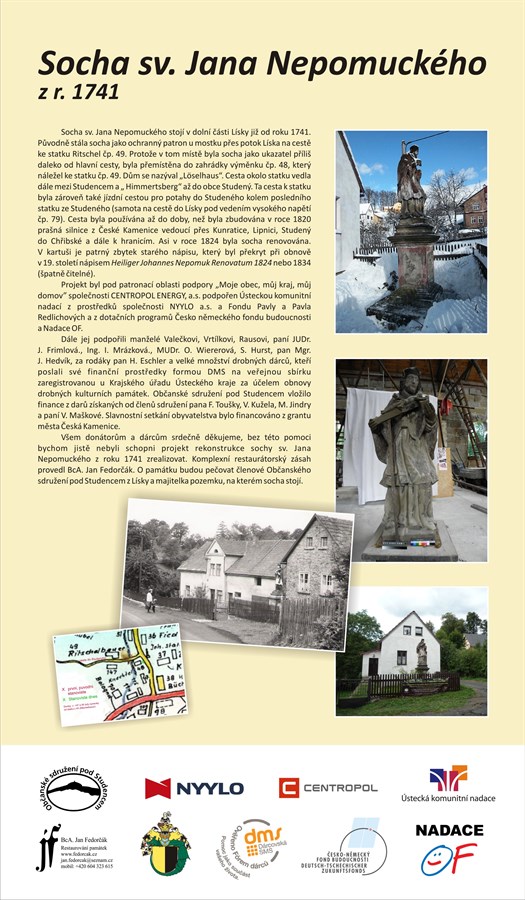 Sběr historických informací o památce a úpravy okolí sochy provedli členové spolku. Další etapou byly odborné práce restaurátora. Projekt mohl být realizován díky příspěvku Česko německého fondu budoucnosti. Partnerem projektu na německé straně byl pan Eschler, rodák z Lísky, který také projekt finančně podpořil. Dále projekt podpořili další soukromé osoby a nadace. Po instalaci obnovené sochy došlo 6. 9. 2014 k slavnostnímu setkání místního obyvatelstva s rodáky u příležitosti požehnání památce, které vykonal hlavní celebrant J. M. can. K. Jordán Červený, děkan v České Kamenici. Za krásného počasí se při této příležitosti sešlo přibližně 100 účastníků, z nichž 20 bylo rodáků z Českokamenicka. Osobně slavnost podpořila také starostka Česká Kamenice, zástupci o. s. Tadeáše Haenkeho z Chřibské a restaurátor J. Fedorčák. Kulturní vystoupení připravili členové Českokamenického pěveckého souboru. Obdiv k obnovené soše sv. Jana Nepomuckého a pocit sounáležitosti byly hmatatelně cítit ve vzduchu, stejně jako dobrý pocit z kvalitně vykonané práce. Všem velice děkujeme za pomoc, díky níž se podařilo zachránit cennou památku pro další generace.