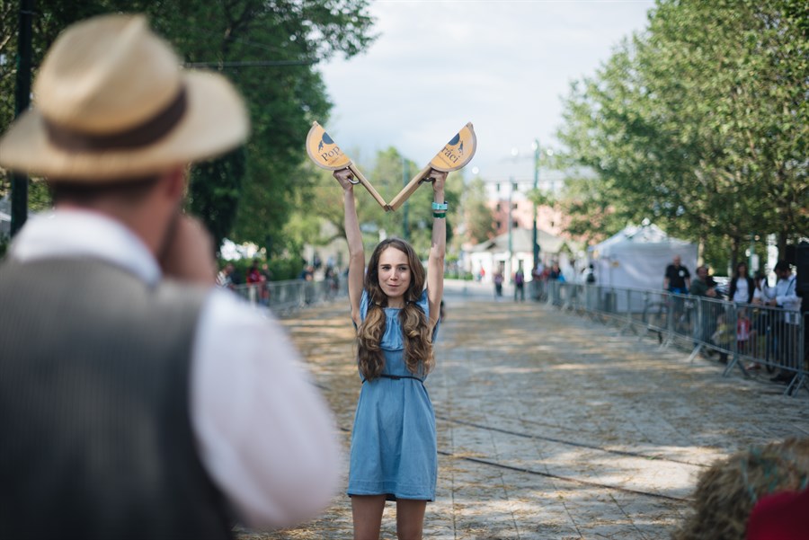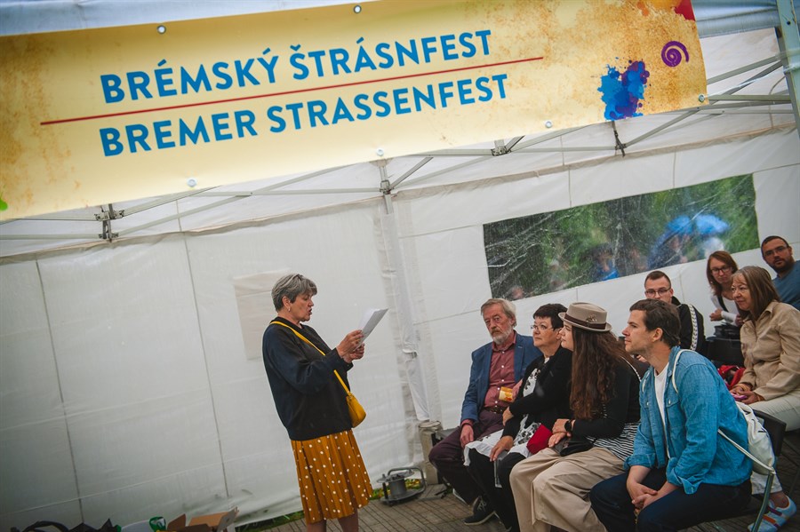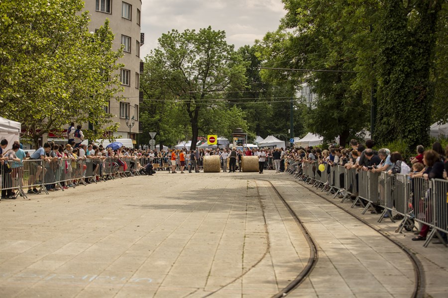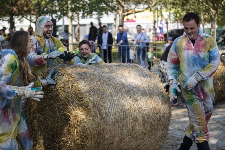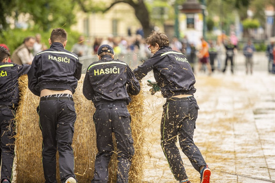 Eine der größten Attraktionen des Tages war zweifelsohne das Strohballenwettrollen – eine Tradition aus dem Berliner Bezirk Rixdorf, die vor mehreren hundert Jahren von böhmischen Exulanten begründet wurde, die nach der Schlacht am Weißen Berg aus ihrer Heimat geflohen waren. Am Strohballenrollen waren insgesamt 14 deutsch-tschechische Teams beteiligt. Ihre Aufgabe war es, nicht nur den 200 Kilo schweren Strohballen möglichst schnell ins Ziel zu rolen, sondern dabei auch noch das Publikum zu unterhalten. Alle Teams haben tapfer gekämpft, am besten waren letztlich die Pfadfinder der Pilsener Organisation Ichtys. Das Geschehen rund um das Stroh wurde auf zauberhafte Weise von Akrobatikkünsten des Ensembles V.O.S.A. bereichert.