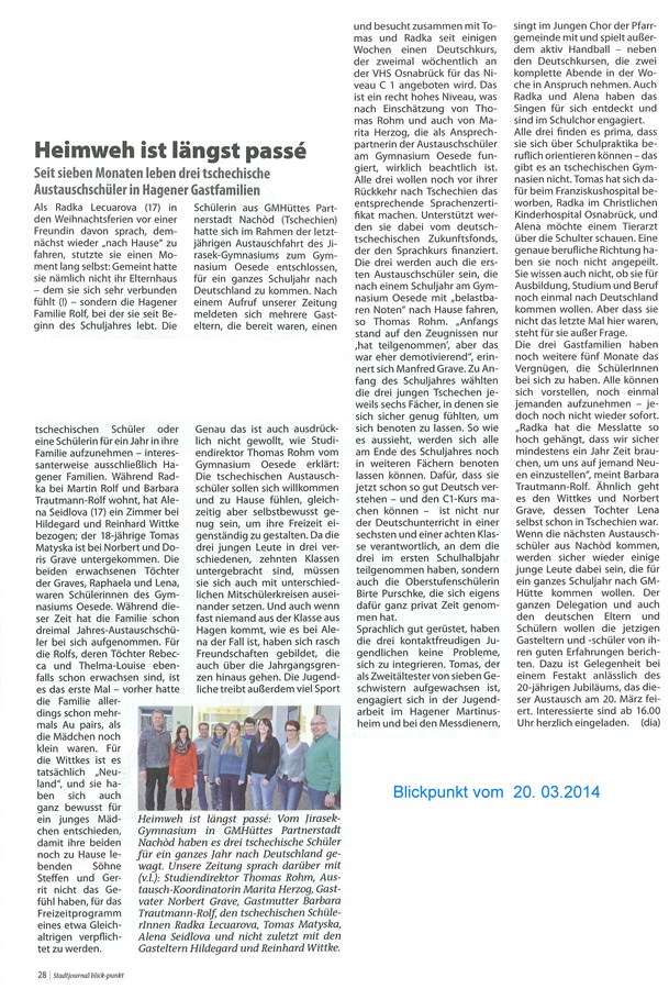 Die Schülerinnen aus Náchod nehmen im Schuljahr 2013/14 am Unterricht in verschiedenen Klassen 10 sowie am Schulleben des Gymnasiums Oesede teil. Sie verbessern ihre Sprachkenntnisse und besuchen einen Volkshochschulkurs auf Niveau C1 des Gemeinsamen europäischen Referenzrahmens für Sprachen. Dabei werden sie von Lehrkräften der Schule, aber auch von einzelnen Schülern des Gymnasiums Oesede tatkräftig unterstützt. Ebenso lernen sie in Gastfamilien deutsche Lebensformen und Gewohnheiten vielfältiger Art kennen. In ihrer Freizeit unternehmen Alena, Radka und Tomáš viel mit Freunden, die sie aufgrund ihrer aufgeschlossenen Art rasch finden konnten. Die drei Jugendlichen haben nicht nur in ihrer Klasse, sondern darüber hinaus auch durch ihr Engagement in Sportvereinen und Kirchengemeinden viele Freundschaften geschlossen.