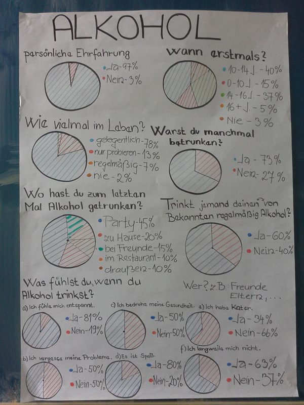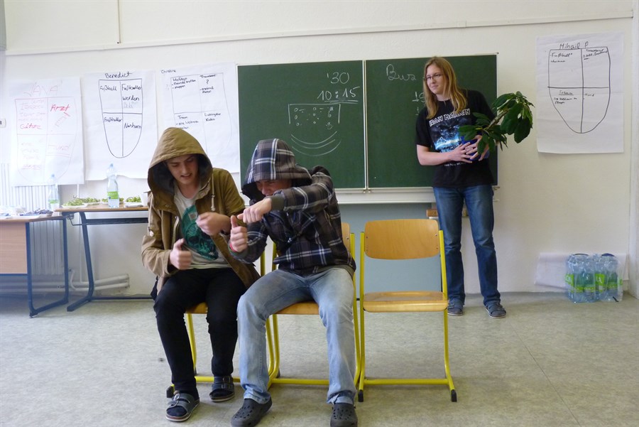 Im Rahmen eines Präventionsprogrammes entwickelten die Schüler Plakate, um detailliert über die Verbreitung, Wirksamkeit, Gefahren etc. der unterschiedlichen Drogen aufzuklären und diskutierten mit Experten darüber. Dank verschiedenen Techniken zeigte sich mehr und mehr, dass die wirksamste Art einer Distanzierung zum beginnenden Drogenkonsum in einer stabilen Persönlichkeitsstruktur begründet liegt. Der präventive Aspekt als eines der wichtigsten Vorhaben dieses Projekts wurde noch weiter am letzten Begegnungstag mit Hilfe des Theaterspielens herausgearbeitet. Durch szenisches Aufarbeiten von Konfliktsituationen – entstanden durch Kontakte mit Drogen (zu Hause, in der Schule, auf der Party, im Park, auf der Straße) – ergaben sich im Anschluss genug Sprechanlässe, die dargestellten Rollen in ihrer Persönlichkeit näher zu beleuchten. Mit viel Mimik und Gestik und durchgängig nonverbal kreierten die Schüler und Schülerinnen spannende Inszinierungen. Auf die Frage, wer schon im Alltag solche Begebenheiten erlebt hat, standen nach und nach circa 20 Schüler und Schülerinnen auf, die davon berichten wollten – und dies in aller Offenheit auch taten.