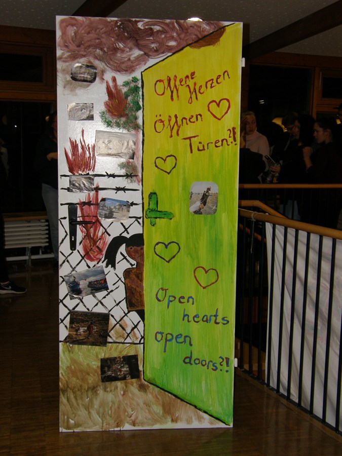 Zum Schluss bemalten sie kreativ und thematisch eine grosse Tür, auf der die Botschaft „Offene Herzen öffnen Türen“, als Symbol unsere Offenheit gegenüber Flüchtlingen, geschrieben stand.