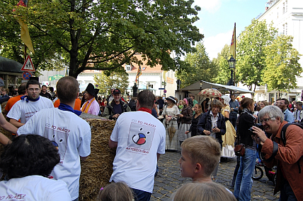 Durch die „POPRÁCI Festspiele“ am 8. September 2012 werden beispielhaft Wege des friedlichen miteinander Lebens von Menschen unterschiedlichster Herkunft, Kultur und Religion aufgezeigt. Das „Strohballenrollen“ ist das Herzstück des Festes. Das Besondere sind die Spielregeln. Es gibt zwei Runden. In der Vorrunde reicht Schnelligkeit allein nicht zum Gewinnen aus. Jede Mannschaft kann zusätzliche Punkte für Originalität der Kostüme, für Fairness und Grazie im Zieleinlauf sammeln, die durch eine international besetzte Jury vergeben werden. Zum Abschluss der Hauptrunde gehört außerdem ein Quiz mit drei Fragen zum Thema „Leben in Rixdorf“. Für die besten drei Mannschaften gibt es die Hauptpreise. Sonderpreise gibt es für Originalität und Einheitlichkeit der Kostüme, für Schnelligkeit und für Gemütlichkeit.
