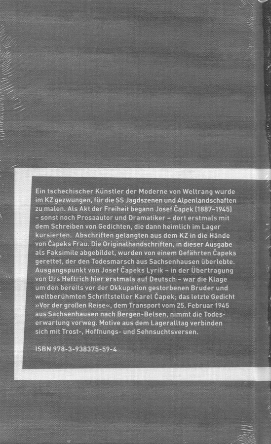 Der tschechische Avantgardemaler und Schriftsteller Josef Čapek (1887-1945) war einer der entschiedensten Verteidiger der tschechoslowakischen Demokratie und einer der ersten Intellektuellen, die die Gestapo 1939 verhaftete. Er durchlitt vier Konzentrationslager, bevor er 1945 in Bergen-Belsen starb. Im KZ begann Josef Čapek zum ersten Mal in seinem Leben Lyrik zu schreiben. Sie wurde 1946 von dem Dichter Vladimír Holan postum veröffentlicht. Eine repräsentative Auswahl von 44 dieser Gedichte wurde nun in der Übersetzung von Prof. Dr. Urs Heftrich beim Arco Verlag auf Deutsch vorgelegt. Der reich ausgestattete Band zeigt auf der linken Seite jeweils die tschechische Originalhandschrift aus dem KZ als Faksimile und auf der rechten Seite die deutsche Übertragung. Zusätzlich werden Zeichnungen Josef Čapeks aus dem Lager sowie Fotografien und Faksimiles von Briefen aus Sachsenhausen an seine Frau aufgenommen. Ein ausführliches Nachwort, eine editorische Notiz und ein Kommentar von Prof. Dr. Jiří Opelík, dem führenden Kenner von Čapeks literarischem Schaffen, ergänzen den Band. Es handelt sich um die weltweit erste Übersetzung dieses Werks in eine Fremdsprache und eine der wenigen Übersetzungen aus dem Oeuvre von Josef Čapek überhaupt. Einzigartig ist auch der Bildteil des Bandes – eine so umfangreiche Auswahl von Faksimiles aus den Handschriften der Gedichte wurde noch nie publiziert. Die Reproduktion der Handschriften bringt das Werk zugleich dem tschechischen Leser näher.