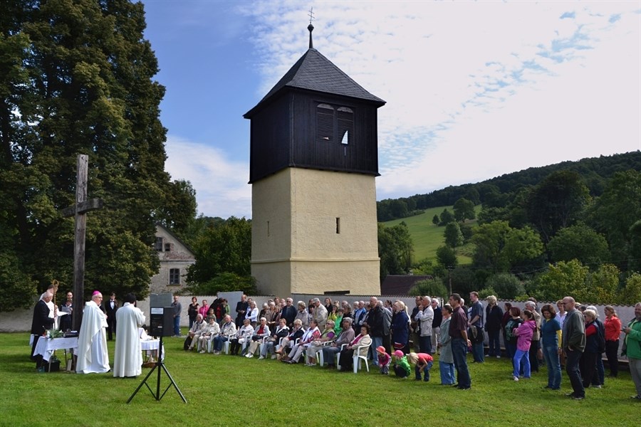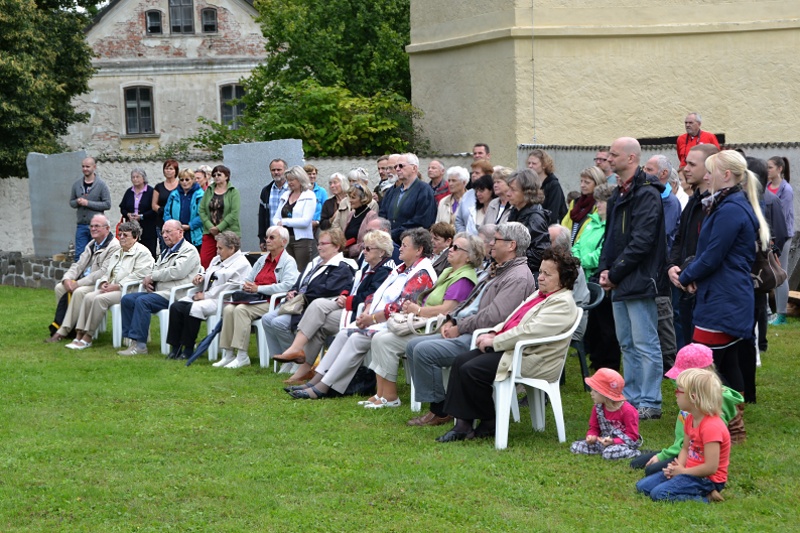 Der wichtigste Tag des ganzen Projektes war der 23.8.2014, an dem in einer feierlichen Hl. Messe unter freiem Himmel die neuen Glocken geweiht wurden. Diese Einweihung wurde von Marcel Hrubý (Pfarrei Merboltice) und vom Leitmeritzer Bischof Mons. Jan Baxant durchgeführt. Anschließend wurden die Glocken mit einem Krahn in den Glockenturm gehoben, wo sie von Mitarbeitern der Glockengießerei in Empfang genommen und an ihrem Platz gehangen wurden. An diesem feierlichen Tag hat gleichzeitig das Treffen von ca. 40 ehemaligen Einwohner Merboltices stattgefunden, die jetzt in Deutschland beheimatet sind und sich regelmäßig alle zwei Jahre treffen. Die Besucher schauten sich den Ort an und bei einem feierlichen Mittagessen wurden anstehende Fragen beantwortet. Neben den deutschen Gästen waren selbstverständlich auch etwa 70 jetzige Bewohner Merboltices anwesend. Eingeladen wurden auch Persönlichkeiten des öffentlichen Lebens aus den umliegenden Ortschaften. Zum Mittag ertönten die neuen Glocken, zusammen mit der schon vorhandenen Glocke Katharina das erste Mal. Der ganze Tag war von einer freundschaftlichen Atmosphäre geprägt. Auch fehlten die Tränen der Rührung nicht, als die Glocken das erste Mal erklangen.